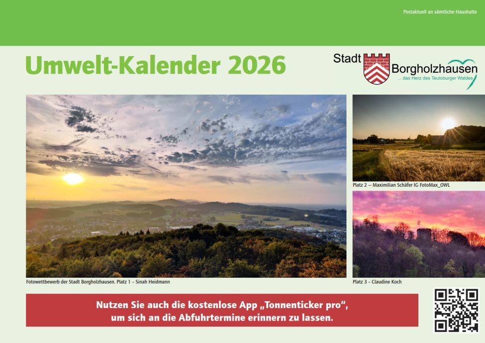 Gelber Sack, Papiertonne, Restmüll? Wann muss ich was raus stellen? Zu welchem Abfuhrbezirk gehört meine Straße. Diese Informationen und vieles mehr zum Thema Abfall und Umwelt finden Sie im Umweltkalender. Der Umweltkalender 2026 wird ab der 47. KW durch die Post an alle Haushalte in Borgholzhausen verteilt. Wer bis Mitte Dezember 2025 keinen Kalender bekommen hat, melde sich bitte im Rathaus.